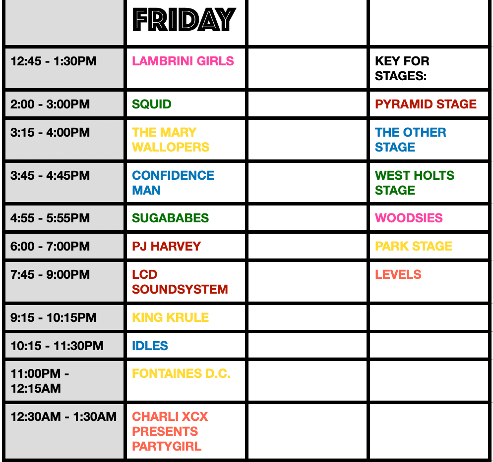 Once your weekend has peaked with the Sugababes, you wanna head to the Pyramid stage for the first time this weekend. Granted, you won’t be spending too much time there, the headliners are pretty meh aren’t they. But you can spend a solid 3 hours there on Friday night. Kicking off with the legendary PJ Harvey at 6:00pm and following that up with LCD Soundsystem at 7:45pm. You can ‘dance yrself clean’ and act like ‘daft punk is playing at your house’… That was poor I won’t do that again, apologies.