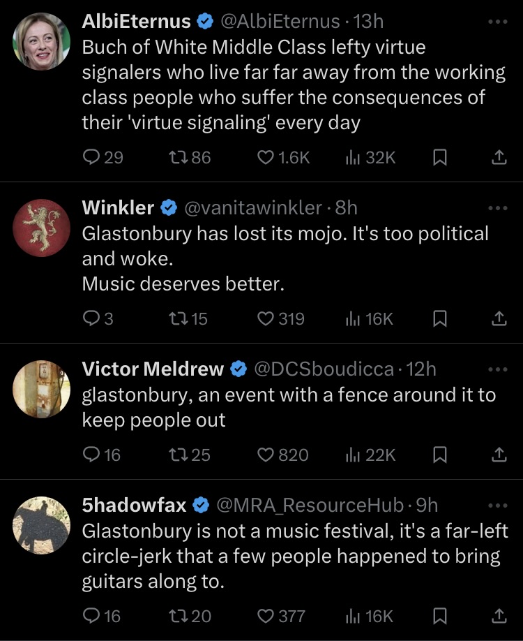 I really didn’t want to justify these with a response, but that first one by ‘_noycey’ is just too good not too. Apparently having multiple no. 1 albums featuring anti-fascist tunes AND a Glastonbury headline set heavily focused on anti-fascist messaging doesn’t constitute anti fascism work?? Really? Please let me know what else they should do… Start a hashtag?